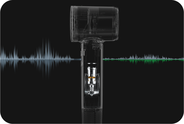 整体机身内风道,空气动力学系统优化; 加工精度精确到0.001mm,整体机身为抖动与摩擦降到最低,电磁噪音控制在20kHz以下。马达风叶动平衡校正至1mg,将转动摩擦及抖动尽可能降低。无碳刷马达,无接触,无额外噪音。进气口滤网优化,将进气口噪音将至最低。